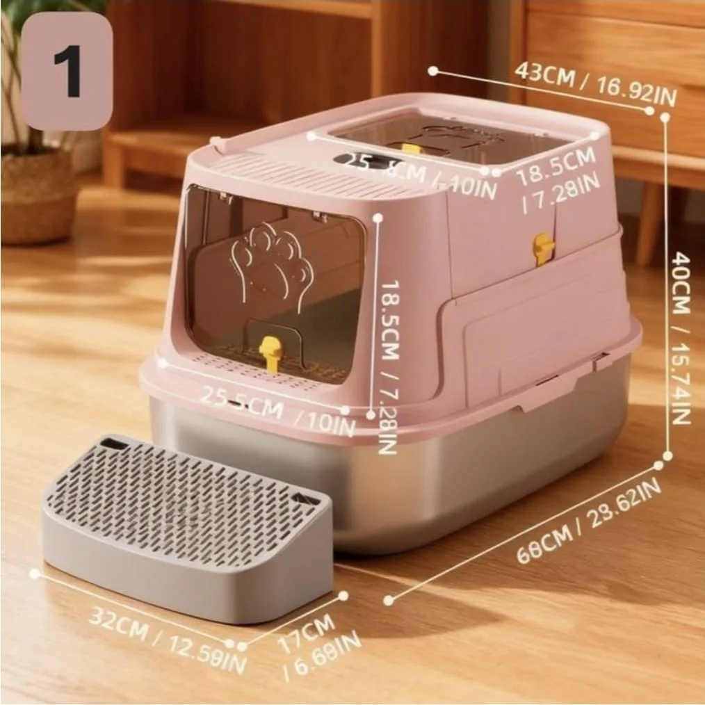 Bac à litière pour chat en acier inoxydable – grand format 60 cm avec entrée en coin et pelle incluse